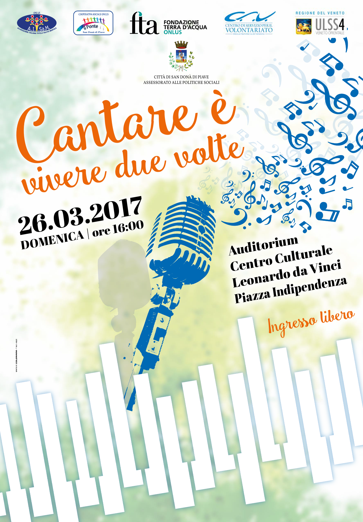 La Fondazione Terra d’Acqua è lieta di essere tra i sostenitori dell’iniziativa “Cantare è vivere due volte“, Concerto organizzato dall’AITSAM (Associazione Italiana Tutela Salute Mentale) di San Donà di Piave, con l’Assessorato alle Politiche Sociali, l’ULSS 4, il Centro Servizi per il Volontariato e la Coop. Sociale Onlus “Il Ponte” e in programma domenica 26 marzo presso l’Auditorium del Centro Culturale “L. da Vinci”con inizio alle ore 16.00.
